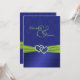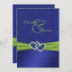 Add some sparkle to your wedding or special celebration with this invitation royal blue and green damask wedding invitation with pleated LOOK and a green PRINTED ON ribbon and a pair of blue FAUX glitter and diamond jewel joined hearts on it, shown here on basic paper. There is a front monogram area that you can change out to suit your needs, or remove it entirely if you prefer that. All the text is customizable and so are the paper choices. If you require any other items in this same design,  Existing matching items are shown below.