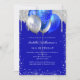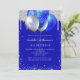 A royal blue background. Decorated with faux silver glitter drips paint dripping look, sparkles and balloons. Personalize and add a name and party details. The name is written with a hand lettered style script.