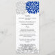 © 2013 Socialite Designs. Our elegant personalized wedding menu card has royal blue and silver-grey colour flowers on the front and back. The front includes the couple's names and wedding date. The back includes the menu items. Please contact Socialite Designs if you require help with customizing this menu card for your event.