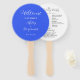 Wedding day program printed on a round style hand fan that features a trendy, royal blue colour background on the front side with the bride and groom names in white, stylized script. Back side of program lists the wedding party participants and ceremony rites on a white background with dark grey lettering. Edit hand fan and replace wedding program info with your own. Perfect for an indoor or outdoor wedding ceremony! Select number of hand fan programs desired.