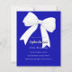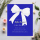 A royal blue coloured background, decorated with a large white bow. Personalize and add a name and party details.