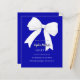 A royal blue coloured background, decorated with a large white bow. Personalize and add a name and party details.