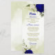 Beautiful wedding menu card featuring royal blue and white flowers and green leaves