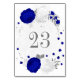 Romantic royal blue & white flowers with silver leaves botanical wedding table number card.