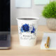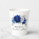Elegant royal blue white silver theme bridal shower paper cup featuring elegant bouquet of royal blue, Navy, silver, pure white colour rose flowers buds and sage green eucalyptus leaves. Please contact me for any help in customization or if you need any other product with this design.