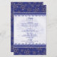 You can customize the text on this royal blue, navy blue, and white snowflake and lace winter wedding or special occasion menu card. To change the text, use the personalize option. For more extensive changes to the menu, including changes to the font, font sizes, font colour, or text placement, use the customize it option. A beautiful choice for a snowflake themed wedding in the winter or any other special occasion such as an anniversary, or birthday party. The colours are sophisticated and elegant.