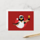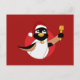 Postcard with an illustration of cute little royal penguin holding a sceptre and wearing a red Santa hat; Christmas holiday cartoon design for kids, on a red background