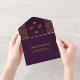 A royal purple wedding invitation with beautiful golden decoration with golden roses in an attractive shape