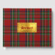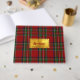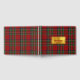 Colourful all purpose guest book done in the classic red, green, blue, yellow, black, and white Royal Stewart tartan plaid pattern. A gold tone text area, on the front of the book, has red custom text ready to personalize.