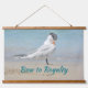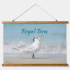 A set of 3 real wood topped hanging tapestries each with a different photographic Royal Tern posing on a sandy beach with beautiful tropical blue sea water background. Each wall art is individually customizable for your own text or Names.