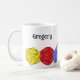 This coffee mug has colourful illustrations of fantasy game style dice with 4-sided, 12-sided and 20-sided dice. Above the graphic is a spot to add a name or other custom text. Perfect for fans of different RPG games and board games. The name appears on both sides of the mug and the graphics wrap around the mug.