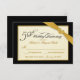 Create your own personalized RSVP cards for 50th Wedding Anniversary Party Invitations -- Beautiful black and gold with ribbon and golden gemstone heart. Classic engraved-look typography with fancy vintage style swash script lettering -- Elegant, affordable luxury, and uniquely customized for you! Just add the names, date, and details for your special milestone anniversary celebration. **NOTE: All elements of this design are part of the PRINTED image -- the ribbon, jewelled brooch, and frame are NOT raised, embossed, or presented as real embellishments. Sized for small invitation cards. Click "Customize It" to change the size, paper options, or font choices. Other sizes and styles available in gallery. © Teri Francis. Coordinating sets with matching postage and thank you cards available upon request.