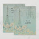 Aqua blue grey colour background colour way. Matching RSVP Response return card that includes white envelopes at no additional charge. Though this artwork looks vintage it is newly painted by Audrey Jeanne Roberts in an antique Parisian retro colour palette and style Wedding invitation set. Inspired by turn of the century wallpaper in a floral swag with swirl scroll borders, the Eiffel tower in the background and an elegant chandelier. Beautiful hand lettering handwriting fills the background along with a hand written "Paris." There is a complete wedding invitation collection set available to match.