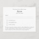Ce modèle RSVP recto verso vous permet d'ajouter les deux côtés du modèle texte pour ajouter les détails RSVP requis, y compris le mariage, le baby shower, la graduation, la retraite, quinceanera, le baptême ou d'autres options de menu d'événement et les restrictions ou allergies alimentaires. Essayez Zazzle's FREE LIVE DESIGNER (via l'onglet LIVE de la page produit pour obtenir de l'aide sur la conception et créer des articles correspondants. Pour obtenir des renseignements sur la façon de prendre en charge un mariage qui est inclusif pour les personnes ayant des restrictions alimentaires et des allergies, ainsi que des options de menu et des idées pour chaque type d'allergie, visitez le site https://www.budgetweddinginvites.com/post/menu-options-for-wedding-guests-with-allergies-and-free-menu-with-ingredients-template-download . Voici quelques options de texte RSVP alternatives : 1. Déclin malheureusement - Malheureusement, je ne pourrai pas y assister. Merci pour l'invitation ! 2. Happily Accepter - Je suis ravi d'accepter votre invitation! J'ai hâte de fêter avec toi. 3. Désolé, Incapable de participer - Je suis désolé, mais je ne serai pas en mesure de le faire. Merci de m'avoir inclus dans votre journée spéciale. 4. RSVP enthousiaste - Composez-moi ! Je suis excité de me joindre au plaisir. 5. Malheureusement incapable de participer - Malheureusement, je ne serai pas en mesure de le faire. Je vous souhaite le meilleur pour un événement merveilleux. 6. Accepter avec enthousiasme - Oui, j'aimerais y assister! J'ai hâte de fêter avec toi. 7. Déclin tristement - J'aimerais pouvoir être là, mais malheureusement je ne serai pas en mesure de le faire. Merci pour l'invitation. 8. RSVP avec plaisir - Je suis ravi de RSVP avec un oui retentissant! J'attends ça avec impatience. 9.Apologétiquement Incapable d'assister - Je suis tellement désolé, mais je ne serai pas en mesure de le faire. Merci de compréhension. 10.Heureusement RSVP - Absolument ! Je serai là avec des cloches. J'ai hâte de fêter ça. Voici quelques phrases RSVP plus courtes : 1. Je ne peux pas y arriver, désolé. 2. Sera là, excité ! 3. Regrettablement en déclin. 4. RSVPing avec plaisir ! 5. Malheureusement, je ne peux pas y assister. 6. Faites-moi entrer ! 7. Excusez-moi, impossible d'y assister. 8. J'attends ça avec impatience ! 9. Je n'ai pas pu le faire, désolé. 10. Oui, avec plaisir !