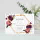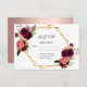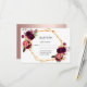 Une carte RSVP élégante pour un mariage avec des modèles pour répondre par date, noms, etc. Plumes et roses aquarellés, fleurs en bordeaux. Un faux cadre doré et blanc. Un arrière - plan blanc devant, du texte noir. Retour : Nom de la mariée et du marié, et date du mariage. Un arrière - plan rose à l'apparence métallique. Texte noir.
