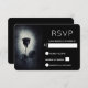 Une carte de réponse de mariage sombre et mystérieuse avec une illustration cool d'une rose noire de style gothique / emo avec du sang rouge qui coule sur ses pétales. Un fond grunge noir avec une couleur blanc cassé au centre mettant en valeur cette rose lunatique et macabre.