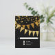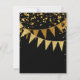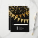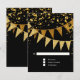 RSVP response return card with envelope. Sleek. Modern. Chic. Understated glam - with glittering pennant banners in two shades of golden glitter with sparkling twinkling falling confetti in various sizes and shade of gold. Sparkly starburst shining stars highlight the sparkle. A very contemporary typography text layout that is anything but traditional. It is simple and short. It says to your guests, "We're throwing a party and it will be the party of a lifetime!" For the elegant but non-traditional bride and groom. COLORS: jet black and gold, golden glitters. Especially suited for fall or winter weddings, New Year's Eve Parties, Birthday parties and Anniversary party announcements.