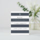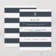 GAMME DE COULEURS : bleu marine et blanc COLLECTION DE DESIGN : Cartes de réponse RSVP à design vertical assorti avec choix de menu (il suffit de supprimer ou de remplacer le texte sur cette ligne si vous n'en avez pas besoin). Avec un thème de design chic et tendance à larges rayures, cette invitation a un style contemporain dans l'air du temps. Chaque couche de texte alterne avec le bleu foncé et le blanc pour un effet simple mais époustouflant. Graphique audacieux, mais élégant et avant-gardiste. Nous disposons d'une gamme complète de produits coordonnés. L'initiale monogrammée et les informations de RSVP sont faciles à personnaliser grâce aux champs de modèle de personnalisation.