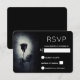 Une carte de réponse de mariage sombre et mystérieuse avec une illustration cool d'une rose noire de style gothique / emo avec du sang rouge dégoulinant sur ses pétales. Un fond grunge noir avec une couleur blanc cassé au centre mettant en valeur cette rose sombre et macabre.