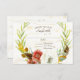 RSVP Response card with guests name(s) and responses for an accurate head count for your catering. Hand painted in watercolor for a rich, elegant and modern touch. The background is of softly painted birch bark with a eucalyptus wreath, acorns a deep red burgundy poppy, white anenome flower, feathers and assorted leaves arranged in a modern BOHO, Bohemian style wreath. Copyright, Audrey Jeanne Roberts, all rights reserved.
