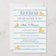 Rub-a-dub-dube, a precious new baby to love! We've designed cute watercolour yellow rubber duckies that are swimming on the blue water stripe pattern. The invitation details are between the stripe pattern. The reverse side is a navy blue background, with a cute yellow rubber ducky and mommy to be names placed below. All illustrations contained in our yellow rubber ducky baby shower invitation are hand drawn original artwork by Moodthology.