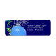Voici une étiquette d'adresse de retour en bleu et argent qui est festive pour la saison des Fêtes. Il dispose d'une jolie ampoule bleu clair de vacances contre une douche de flocons d'argent. Des brins de ruban dorés bleu, vert et bleu brillant pendent devant l'ampoule. Votre texte personnalisé est en blanc. Les images et le texte sont placés sur un arrière - plan bleu foncé dramatique.