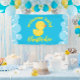 Rubber Duck Welcome Baby Name Hanging Vinyl Banner in Blue.