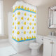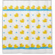 White shower curtain with rows of yellow rubber ducks and blue stripes