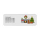Illustration originale de Destei d'une jolie couleur de rubis Cavalier King Charles Spaniel race dog. A côté du chien, il y a une zone de texte personnalisable. Le chien est placé dans un salon festif qui a une cheminée. Deux bas rouges pendent sur le manteau de la cheminée. Sur le dessus de la cheminée, une couronne verte ornée d'un arc rouge et de cercles jaunes illuminés. Au-dessus du manteau, trois petits arbres en forme de triangle sont également décorés de cercles jaunes. De l'autre côté du mantel, deux bougies beiges. A côté de la cheminée, un sapin de Noël vert et festif avec deux cadeaux. Le sapin de Noël est orné de décorations rouges et jaunes et d'une guirlande grise. Au sommet de l'arbre se trouve une étoile jaune.
