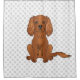 Destei's original cartoon illustration of a cute ruby colour Cavalier King Charles Spaniel breed dog who is sitting. The background has a pattern of grey dog paw prints.