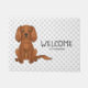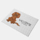 Destei's original cartoon illustration of a cute ruby colour Cavalier King Charles Spaniel breed dog who is sitting. There is also text that now reads "Welcome" together with a personalizable text area for a family name or other custom text. The background has a pattern of grey paw prints.