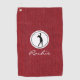 Black silhouette of lady golfer in a round white frame with name, on a ruby red denim print golf towel. Personalize the name to create a unique golf gift and keepsake. Change text to make it yours using the simple Template provided. Dimensions: 16" x 24", 80% woven polyester/ 20% polyamide blend microfiber, grommet and brass-plated hook included. Machine washable.