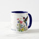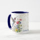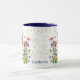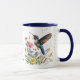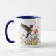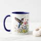 This pretty personalized mug features a brightly coloured ruby throated hummingbird hovering above a cluster of spring flowers. The image is printed twice on the mug, with your name or other text between them. Everything is placed on a gold confetti splatter background.