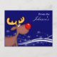 Rudolf the red nosed reindeer character on a blue snowy background. Cute Christmas greeting card design.