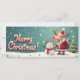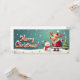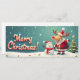 Children's illustration of Rudolph the reindeer disguised as Santa Claus and his snowman companion. "Merry Christmas" text banner