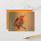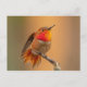 Postcard featuring a rufous hummingbird perching on a branch, with ruffled wing and tail feathers. He is also showing off his gorgeous brilliant orange throat feathers -- a perfect card for hummingbird, nature and garden lovers! Photo taken in Arcadia, California.