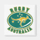 illustration of a kangaroo or wallaby jumping side view with stars and words "rugby Australia" and ball in background