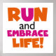 If you love to run, run 5Ks, 10Ks, half marathons, or marathons, you'll love this colourful text design in orange and hot pink that reads Run and Embrace Life! Run and Embrace Life T-shirts, hoodies, magnets, buttons, cards, stickers, key chains, and lots of other items for runners who love a bright, colourful running design!
