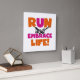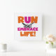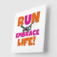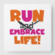 Run and Embrace Life text T-shirts, hoodies, magnets, mousepads, cards, stickers, key chains, buttons, magnets, paper plates and napkins, gift bags, candy tins, watches, and many other items with a bright pink and orange design. These running theme products make great gifts for anyone who runs for fun, runs track, marathons, half marathons, 10Ks, or 5Ks!