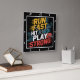 This black wall clock features the text "RUN FAST HIT HARD PLAY STRONG" in a stylized font. The words are stacked vertically, with "RUN FAST" in yellow, "HIT HARD" in blue, and "PLAY STRONG" in red. Graphic elements include running shoes, a dumbbell, and a football helmet, suggesting sports and athleticism.