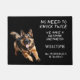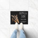 "No need to knock twice, We have a German Shepherd" declares this funny door mat. Your custom text is in white at the right side, while an image of a beautiful running GSD is at the left. Everything is placed on a black background.