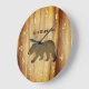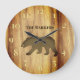 Silhouette d'un ours noir sur une planche de bois rustique. Nom de famille ou de lodge personnalisable. Style montagnard rustique.