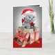 Cat Christmas Card featuring the adorable Russian Blue Kitten inside a red Christmas box, wearing a cute Santa hat while holding a red Christmas star in its mouth is a one of a kind Christmas Cards by Friskybizpet Design.