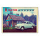 A faux propaganda image featuring a rural scene from the early post-war Soviet Union. Depicts a GAZ M-20 Pobeda automobile, in front of a dacha (rural summer house). Across the upper part of the image is an "M20" hood ornament, Cyrillic (Russian) text reading "ГАЗ" (GAZ) and a side ornament found on the vehicles featuring stylized Cyrillic text reading "Победа" (Pobeda). The image has been "aged" to suggest that it dates from the early post-war period. Internal Soviet propaganda often tried to inform the people how good life was in the USSR. A dacha and a car to get there signified the good life. City dwellers dreamed of having a small plot of land outside the city to flee to on summer weekends, away from the heat and dirt of the city. The Pobeda, was the first automobile manufactured for the public after the end of World War. The M20 was produced 1946 to 1958. GAZ (ГАЗ is a Russian acronym for Gorkovsky Avtomobilny Zavod - Gorsky Automobile Factory) Pobeda (Победа) is the Russian word for victory. The name was chosen because the car was first tested in 1943 when an Allied victory in World War II began to appear likely.The Pobeda was manufactured under license in Poland and a few were assembled in North Korea. The Pobeda was the first post-war Soviet-made automobile and the first Soviet vehicle to have turn signals, two electric wipers, an electric heater, and a built-in AM radio. The car came to be a symbol of postwar Soviet life and is today a popular collector's item. A total of 235,997 Pobedas were produced. A number of M20s have been extensively customized in recent years. There are even a few "muscle car" versions on the road.