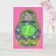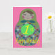 1st Birthday card with an image of a classic shaped Russian Doll with colored circles, on a pink background.