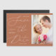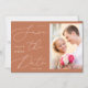 Ce minimaliste moderne garde la date avec une jolie calligraphie, une photo verticale et une palette de couleurs branchée. L'expression "Sauvez la Date" est écrite en caractères manuscrits roses et bleus contre un arrière - plan orange brûlé en terre cuite. Les noms du couple, la date mariage et l'emplacement du mariage sont nichés de façon créative dans la typographie "Save the Date". Une photo verticale est placée à droite du lettrage de la typographie.
