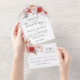 This elegant summer and fall colours floral wedding all in one invitation is designed with an easy to tear off perforated RSVP postcard. Simply fold the card, seal and send (no envelope needed).
