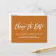 Need to postpone or reschedule your wedding? Alert your guests that your wedding date has changed with this Elegant Wedding Postponement or Date Change announcement featuring a trendy script lettering saying "Change the date" in white over a contemporary rust background.