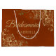 This beautiful gift bag is designed as a wedding gift or favour bag for Bridesmaids. It features an elegant rust orange and gold design with ornate golden curls and swirls in the corners the text "Bridesmaid" as well as a place to enter her name, the couple's name, and the wedding date. Fill with gifts, favours, candy, or any other wedding swag or thank you gifts. Beautiful way to thank her for being a part of your special day.