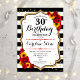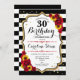 30th Birthday Invitation. Elegant design with sunflowers, red roses, faux glitter gold and black & white stripes. Features stylish script font and confetti. Perfect for an elegant birthday party. Customize with your own details.